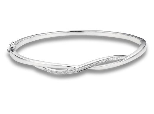 Smooth sterling silver is fashioned into shape in this eye catching bangle bracelet. The bracelet is adorned in round diamonds totalling 0.14 carats.