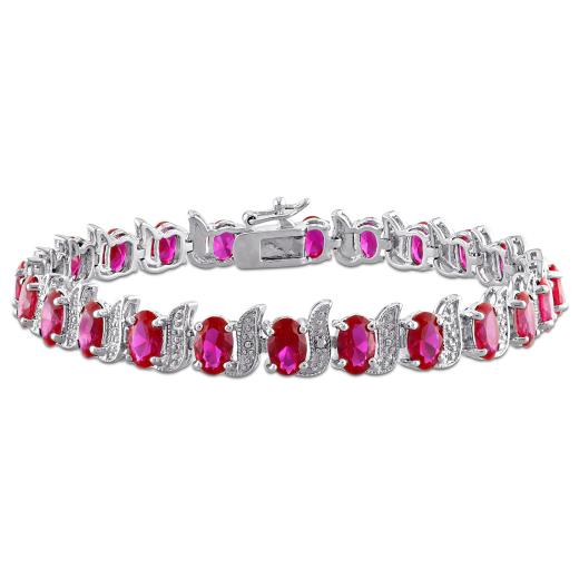 Add a splash of vibrant colour to your look with this stunning 18 CT TGW Created Ruby S-Link Tennis Bracelet. Crafted in sterling silver, this 7-inch bracelet features a series of created rubies in an elegant S-link design. The rich red hues of the rubies are beautifully complemented by the shining sterling silver, making this bracelet a perfect accessory for both special occasions and everyday wear.