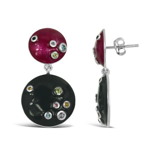These striking sleek sterling silver earrings showcase round cut amethyst, blue topaz, citrine, peridot and white topaz gemstones accented by black & white enamel.  Day or night - these earrings will always complete your look!