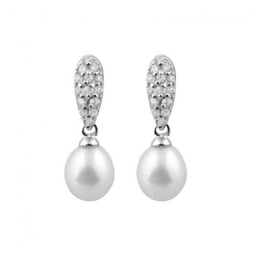 Fancy sterling silver rhodium plated earrings with 8-8½mm white rice shaped freshwater pearls and cubic zirconia.