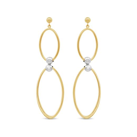 These 10K two-tone gold oval drop earrings offer a chic and modern touch to any ensemble. With their elegant design and contrasting gold hues, they gracefully catch the light, adding a refined yet understated sparkle to your look. Perfect for both everyday wear and special occasions.
