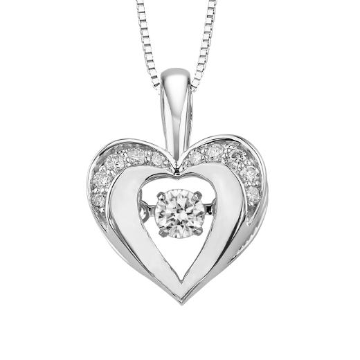 Sweeping 10kt white gold is adorned with brilliant round diamonds in this perfect heart pendant from our Dancing Diamonds Collection. At the centre sits a brilliant round Dancing Diamond that sparkles with your every movement for an unexpected sparkle. This total diamond weight of this pendant is .20ctw and it is suspended from a 17" box link chain. Perceptual motion diamonds that waltz to the beat of your heart.