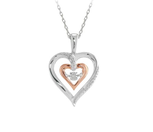 Show her you care and treat her to this pretty Dancing Diamond pendant. Featuring a sterling silver heart design framing an inner 10kt rose gold heart and at its core a sparkling 0.03ct Dancing Diamond. This pendant sways from an 18" chain and will make a truly meaningful gift.