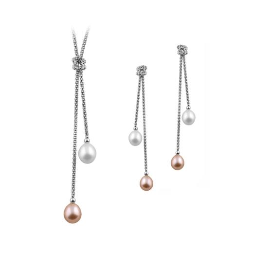 The soft shimmer of the pearls contrasts beautifully with the sleek silver, creating a look that is both striking and graceful.