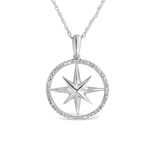 Cast in a glimmering sterling silver, this compass pendant is set with 0.06ctw of dazzling round diamonds. Suspended from an 18" rope chain with a lobster claw clasp, this pendant is a great gift for the intrepid traveller in your life.