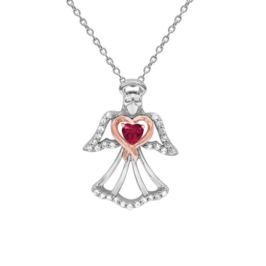 This heavenly angel will warm even the coldest hearts! Crafted in sleek sterling silver and accented with 10k rose gold, , this pendant is adorned with a created ruby heart and accented by created white sapphires. The pendant dangles from an 18’ chain with secure clasp. Buy this angel for yourself or for that special someone in your life.