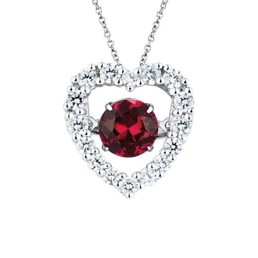A sentimental heart is crafted of sterling silver embedded with sparkling cubic zirconia. A single rich red ruby sparkles with your every move at the centre of this delightful necklace. This pendant sways from an 18’ chain with secure spring clasp.