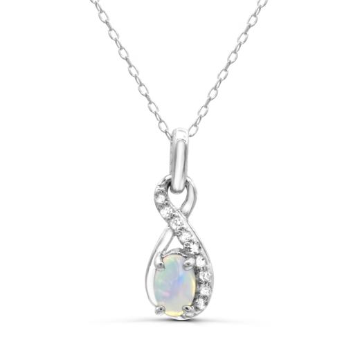 This modern yet classic, infinity design pendant is crafted in gleaming sterling silver and is sure to become a favourite item in your jewellery collection. This item is perfectly adorned with shimmering white topaz and an oval cut opal, which is the birthstone for October. If you are looking for something stunning, order this for yourself or someone you love today!