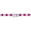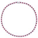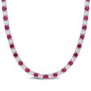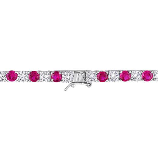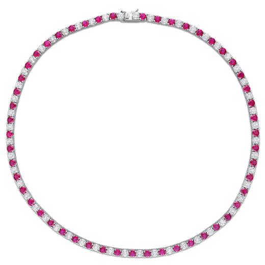 Pamper yourself with this attractive Tennis Necklace. Mounted in glistening sterling silver, this dainty necklace features 52 round-cut created ruby gemstones (4x4mm) and 51 round-cut created white sapphire gemstones (4x4mm) placed alternatively on the strand. This 17-inch necklace is secured with tongue and groove clasp. Polished to brilliance, this classy necklace will add sparkle to your favorite outfit.