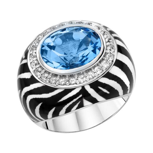 This striking sleek sterling silver ring showcases a large oval blue topaz surrounded by gleaming white topaz and accented by black & white enamel. Day or night - this ring will always complete your look!