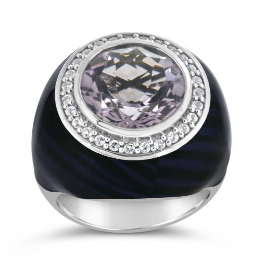 This striking sleek sterling silver ring showcases a large round amethyst surrounded by gleaming white topaz and accented by black enamel.  Day or night - this ring will always complete your look!