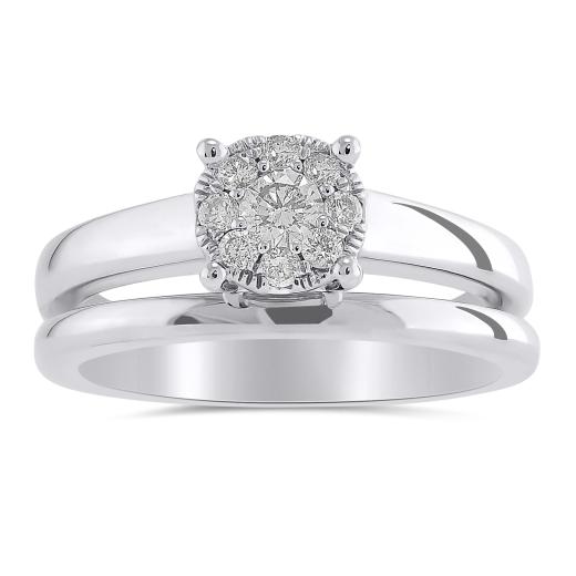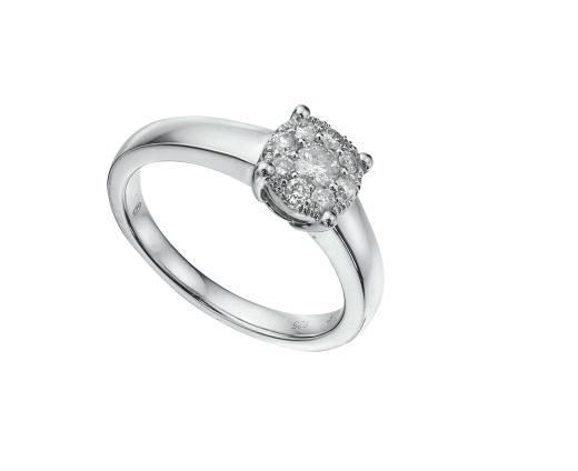 A bouquet of round diamonds forms a circle at the centre of this marvelous ring for her. Sleek white gold forms of the band. This ring has a total diamond weight of .30 carats.
