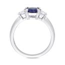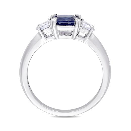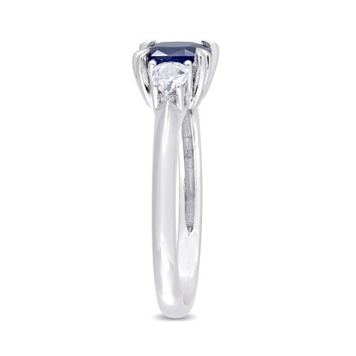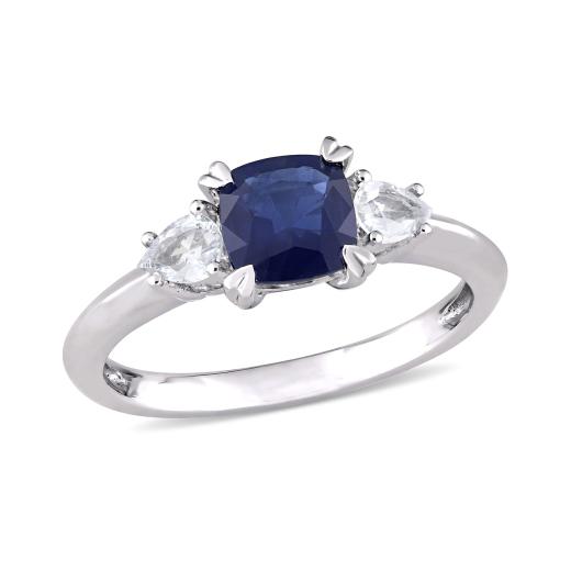 Add a royal appeal to your wedding outfit with this Blue and White Sapphire Three-Stone Engagement Ring. Crafted in luminous white gold, this gleaming engagement ring features a cushion-cut, prong-set vibrant genuine sapphire gemstone (6 x 6mm) at the center, with a pear-shaped, prong-set twinkling white sapphire (4 x 3mm) on each side. Enhanced with a high-polish finish, this sapphire ring is an ideal piece of jewelry for an occasion and is sure to make her shine on her wedding day.