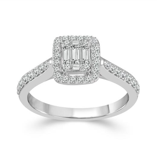 Celebrate your love with this fabulous .50ctw bridal ring from the Times Square collection. Featuring baguette and round diamonds at its centre, this ring sparkles with a beautiful diamond halo and additional diamonds along the 14k white gold band.