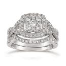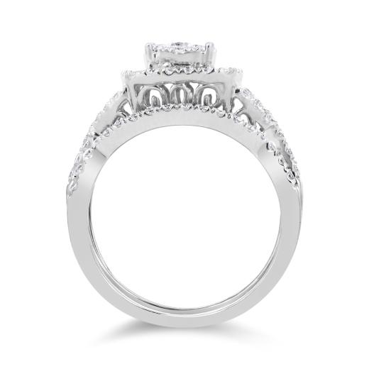 A dazzling token of your love, this 1ctw bridal set is a genuine treasure crafted in 10k white gold. The striking engagement ring features a clustered diamond centre with a floating round diamond halo. Stunning white gold details along the profile of the engagement ring make this a one of a kind piece. Round diamonds along the twisted split shoulder band sits perfectly into the contoured diamond wedding band, featuring a single row of round diamonds.
