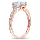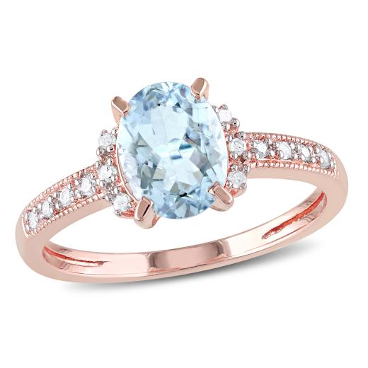 This charming cocktail ring features an oval-cut aquamarine center stone and round white diamond side stones. This exquisite ring is crafted of fine rose plated silver with a textured finish.