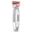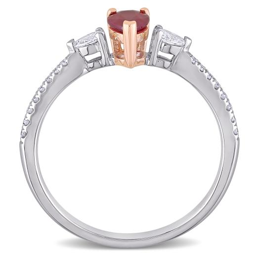 This bold and bright ruby and diamond three-stone engagement ring is crafted in lustrous 14-karat white gold with rose gold accents and features a pear-cut ruby at its center paired with a pear-cut diamond on either side along with 16 round-cut, buttercup-set diamonds in a unique three-stone bridal design. Whether worn as an engagement ring or simply a gorgeous gemstone and diamond piece, this ring is sure to make a standout addition to any jewelry collection. Choose this piece either for yourself or someone you love.