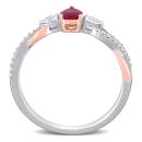 This delicate and sophisticated ruby and diamond heart engagement ring is crafted in lustrous 14-karat white gold with a rose gold accent and features a heart-cut, prong set ruby at its center paired with two pear-cut and 24 round-cut diamonds in a unique three-stone infinity design. Whether worn as an engagement ring or simply a gorgeous gemstone and diamond piece, this ring is sure to make a standout addition to any jewellery collection. Choose this piece either for yourself or someone you love.