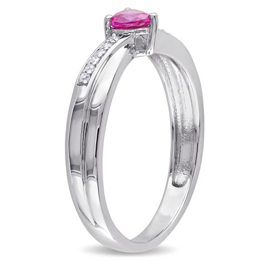 This dazzling ring features a heart-cut ruby center stone and round white diamond side stones set in sterling silver. The ring is enhanced with high polish finish.