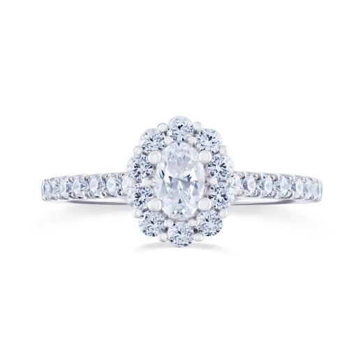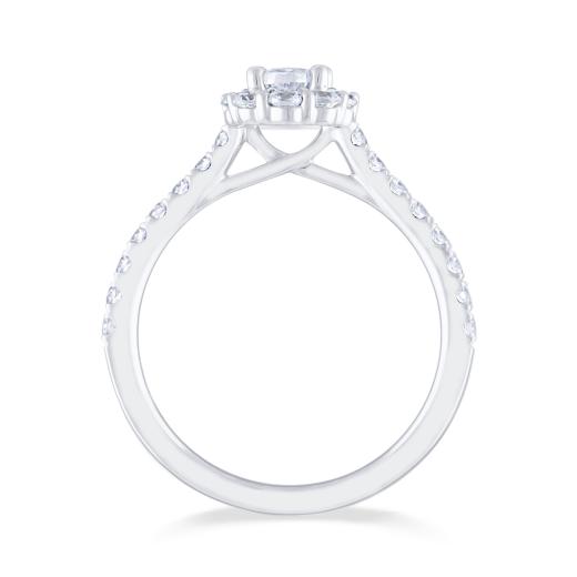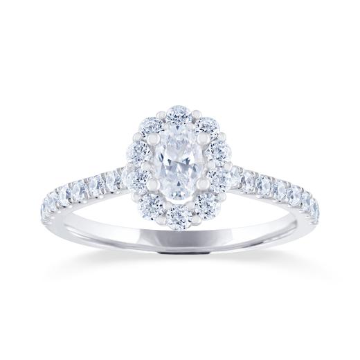 Commemorate your love with a symbol of forever from Diamond Revelations. This breathtaking bridal ring in 14k white gold features an extraordinary .30ct oval cut diamond centre with a vintage inspired diamond scalloped halo. Diamonds along the elegant band elevate this romantic .80ctw diamond bridal ring.