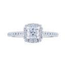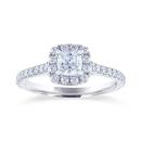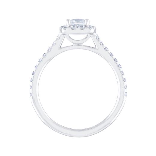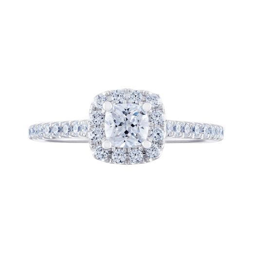 This timeless 14k white gold Diamond Revelations bridal ring is elevated with a .50ct cushion cut diamond at its centre, hugged in a divine halo. Additional round diamonds along the band add glamour to this stunning bridal ring.