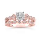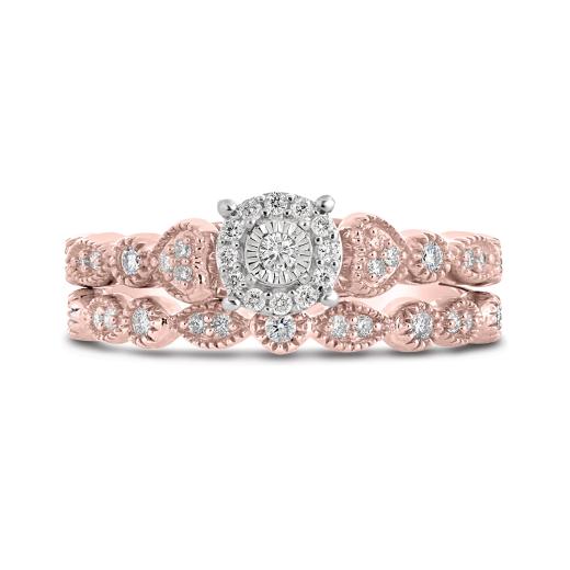 Proclaim your love with a beautiful bridal set designed in adoring 10k rose gold. This .25ctw bridal set features a round centre diamond set into an illusion setting. A halo of round diamonds adds additional sparkle to the centre while feminine diamond details along the band add a touch of charm. The perfectly matching wedding band accompanies the antique inspired engagement ring to complete this romantic bridal set.