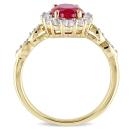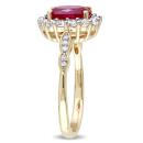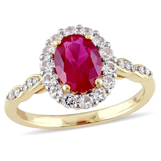 This magnificent birthstone cocktail ring features an oval-cut created ruby center stone surrounded by a halo of round white topaz side stones adorned with round white diamonds in a marquise setting. This elegant ring is set in 14-karat yellow gold and is enhanced with a high polish finish. This ring makes a lovely non-traditional engagement ring, and is the perfect gift to commemorate a special birthday or anniversary.