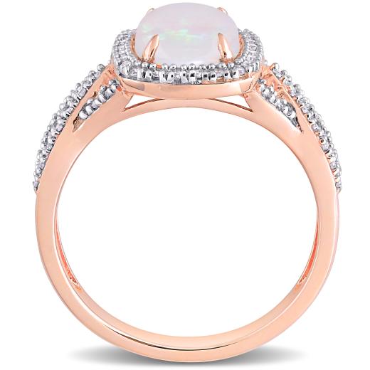 This stunning halo split shank cocktail ring is crafted in radiant 10-karat rose gold. This gorgeous ring features a single oval cabochon-cut, opal center stone surrounded by a halo of round-cut brilliant diamonds and additional diamonds along the split shank band which completes the stylish look of this ring. Wear this bold gemstone and diamond ring on your special evening out and look breathtakingly beautiful. A perfect addition to any jewelry collection.