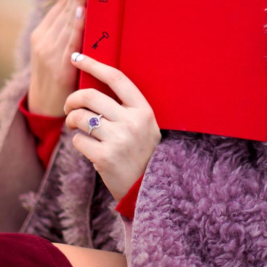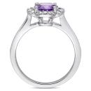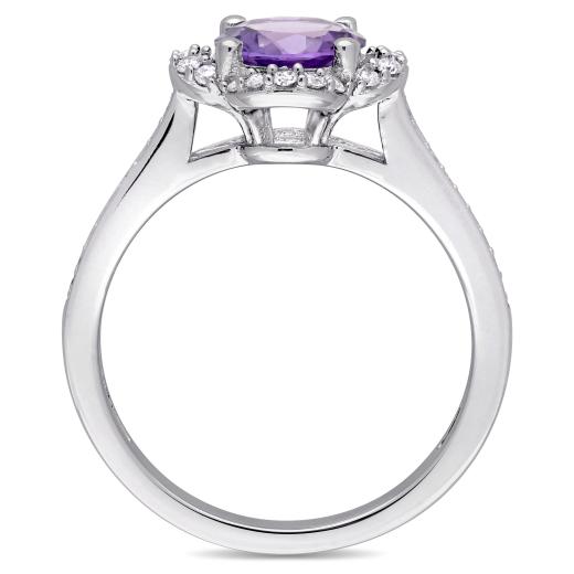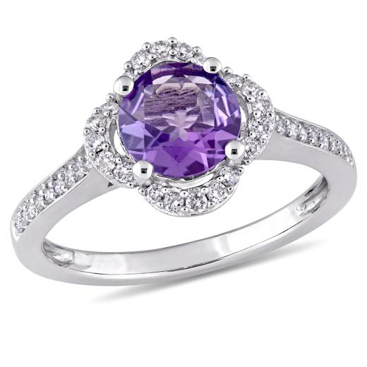This stunning ring is crafted in 14-karat white gold and features a lovely amethyst and diamond quatrefoil halo design. This beautiful ring is a perfect choice either for yourself or someone you love.