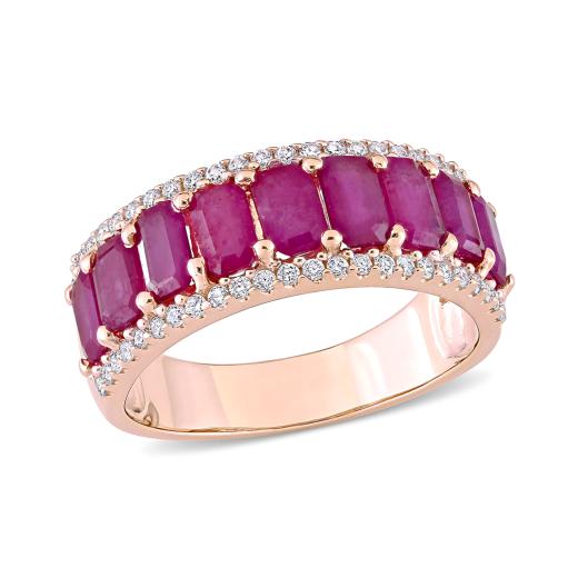 This bold and bright ruby and diamond semi-eternity band is crafted in lustrous 14-karat rose gold and features nine octagon-cut, prong-set ruby stones paired with 48 round-cut, buttercup-set diamonds in a unique alternating anniversary ring design. With exquisite luster and a brilliant shine, this gemstone and diamond anniversary band is sure to make a standout addition to any jewelry collection. Choose this stunning piece either for yourself or as a special gift for someone you love. A perfect choice for that special May birthday in your life.