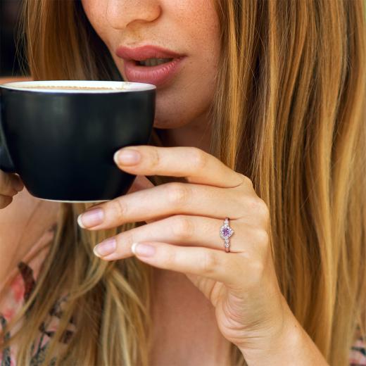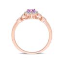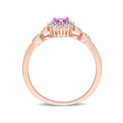 Get your glam on with this exceptional amethyst created white sapphire and diamond accent heart halo ring. Crafted in lustrous rose plated sterling silver, this classic ring features a heart-cut, prong set, amethyst decorated with a halo created by 12 prong-set created white sapphire gemstones and 4 pave-set diamonds embellished halfway on both sides of the band in heart designs. Finished with a brilliant polish, this promise ring is a perfect gift for your beloved partner.