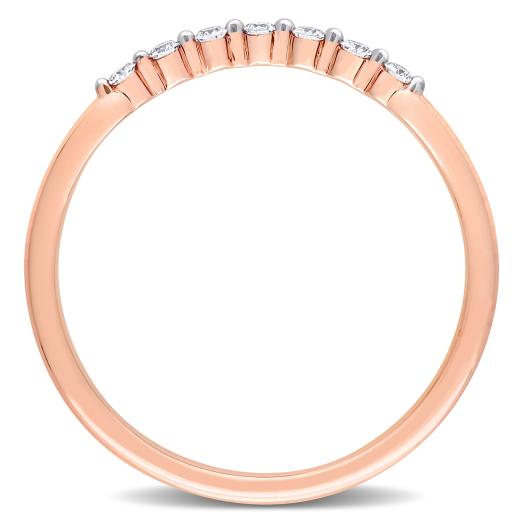 This pretty stackable semi-eternity band is crafted in 14-karat rose gold. This sleek diamond ring features seven round-cut shimmering diamonds that are beautifully embellished on the ring in a prong setting. Enhanced with a high polished finish, this exquisite style is lovely alone or paired with her diamond engagement ring. This diamond ring is a beautiful reminder of your timeless romance. Celebrate your everlasting love story with this stacking wedding ring.