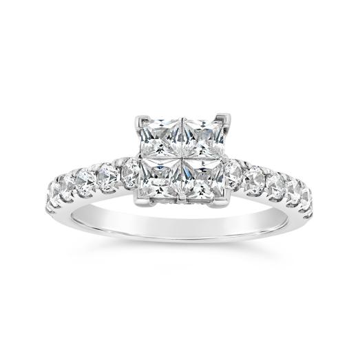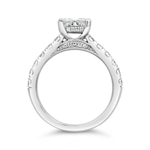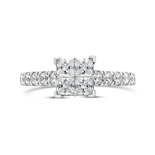 Elevate your love story with the timeless elegance of this 14K White Gold 1.52CTW Princessa Diamond Bridal Ring. The captivating design features a prominent arrangement of four princess shaped diamonds in the center, creating a stunning visual focal point. The surrounding hidden halo of smaller diamonds enhances the overall radiance and adds a touch of sophistication. This bridal ring is a symbol of enduring love, blending classic charm with a modern aesthetic.
