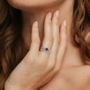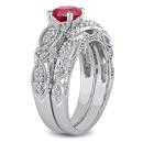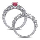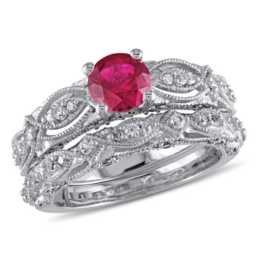 Introducing the exquisite Women's 1/10 CT Diamond TW and 1 3/4 CT TGW Created Ruby and Created White Sapphire Bridal Set Ring in 10k White Gold. This stunning bridal set features an enchanting engagement ring and a matching wedding band, creating a coordinated and vintage-inspired look.The engagement ring showcases a dazzling created ruby center stone with a total gem weight of 1 3/4 carats, radiating a deep and rich red hue. The surrounding created white sapphire gemstones add a touch of brilliance and sparkle, enhancing the overall beauty of the ring. The milgrain detailing adds a vintage touch and further accentuates the intricate design. Crafted in 10k white gold, this bridal set offers a timeless and classic appeal. The engagement ring and matching wedding band complement each other perfectly, symbolizing the unity and commitment of your love.
