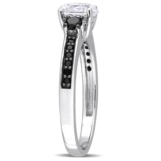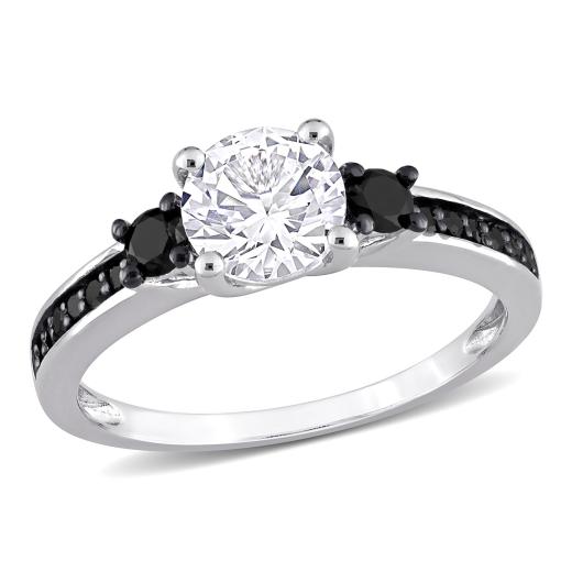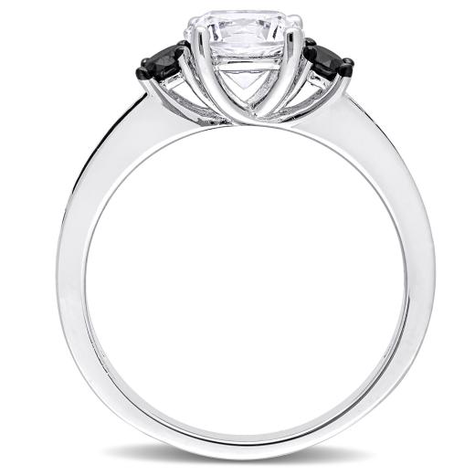 A timeless symbol of your love and devotion, this Created White Sapphire and Black Diamond Engagement Ring is crafted in lustrous sterling silver. This three stone engagement ring features a round-cut prong-set created white sapphire (6.5mm) at its center with a fancy black diamond at both sides. The band is also pave set with 12 round-cut black diamonds, giving this ring a distinctive and trendy look. This black diamond accented engagement ring is the perfect piece of jewelry for the modern bride.