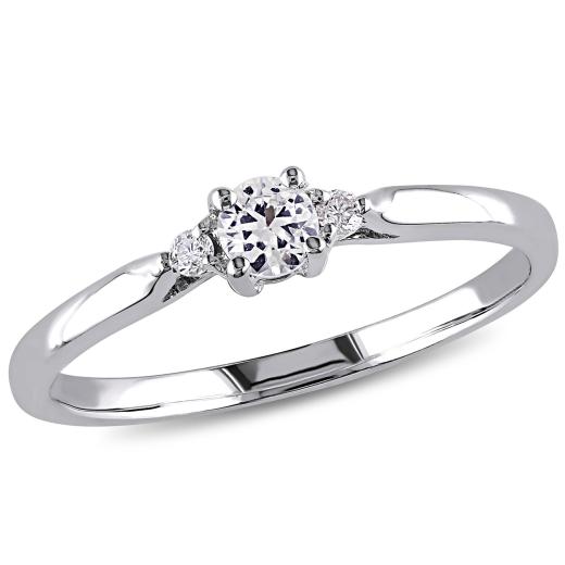 This elegant 1/4ct TGW Round Cut Created White Sapphire and Diamond Accent Ring in Sterling Silver exudes timeless beauty. The round cut created white sapphire center stone is flanked by delicate diamond accents, adding a touch of sparkle. The sleek sterling silver band enhances the overall sophistication of the ring, making it a perfect choice for a subtle yet stunning accessory. Ideal for engagements or special occasions, this ring symbolizes enduring love and elegance.