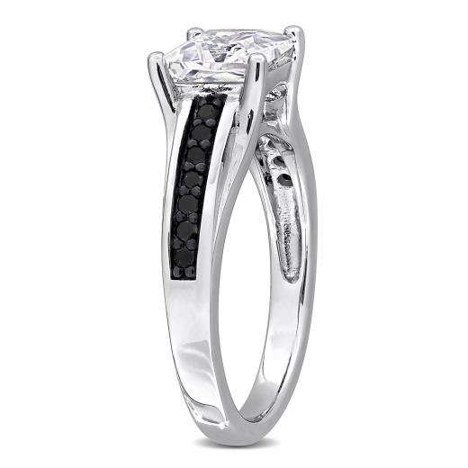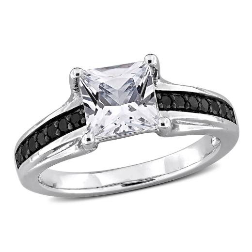 Dramatic and elegant, this ring features a 1 1/3ct TGW created white sapphire as the centerpiece. Set in sterling silver with black rhodium, the band is adorned with 1/7 CT TW black diamonds for a striking contrast. This bold design is perfect for those who appreciate a unique and sophisticated style, making it an exceptional choice for any special occasion.
