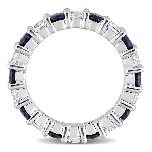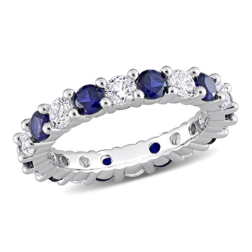 Express your love with this Created Blue and White Sapphire Eternity Anniversary Ring. Crafted in lustrous sterling silver, this ring features 10 round-cut, glittering created blue sapphire gemstones (3.25 x 3.25mm) and 10 round-cut, gleaming created white sapphire gemstones that are embellished on the ring in a prong setting. Coordinate this gemstone eternity anniversary ring with any casual or business attire to look smart and stylish. This enchanting anniversary ring is the perfect choice for your beloved.