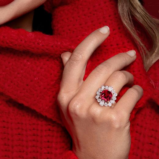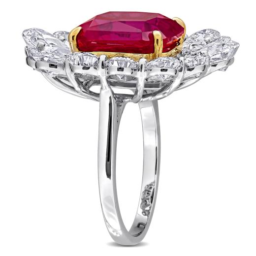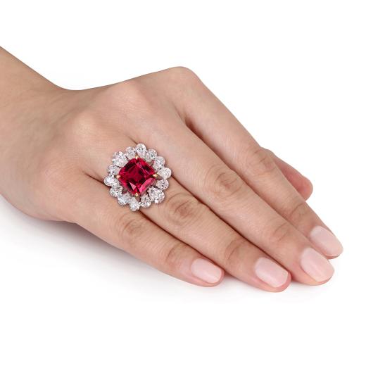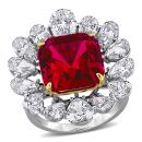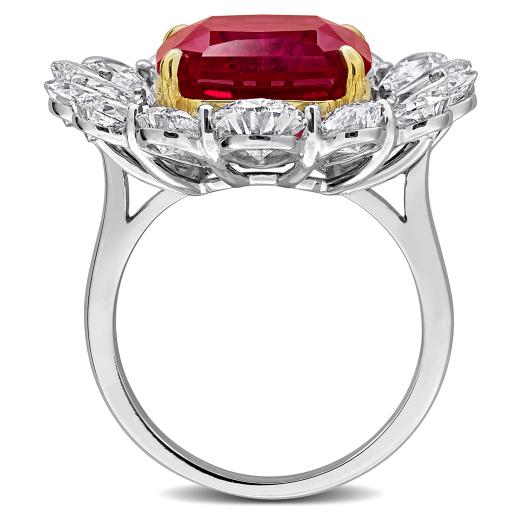 Bold 18K White and Yellow Gold Fashion Ring Set with 5 1/2 CT Pear Lab-Grown Diamonds and 11 CT Created Rubies — A Show-Stopping Statement Piece.