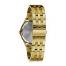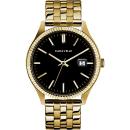 In stainless steel with gold finish, serrated-edge bezel, black dial, luminous hands, calendar, second hand, double-press fold-over clasp, and water resistance to 30 meters.