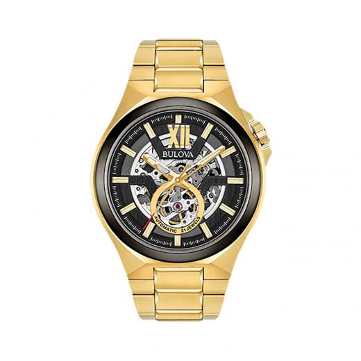 From the Automatic Collection. New Sport style in two-tone gold and gunmetal IP stainless steel case, open aperture black dial with gold-tone accents and black inner dial ring, exhibition caseback, skeleton automatic movement with 40-hour power reserve, sapphire glass, gold-tone stainless steel bracelet with double-press deployant closure, and resistance to 100 meters.