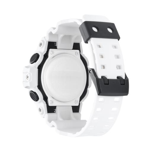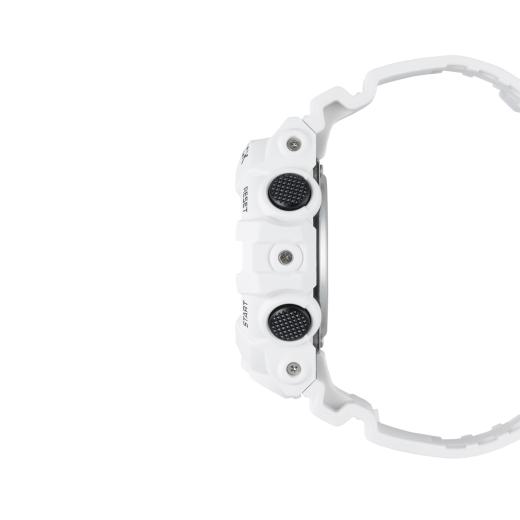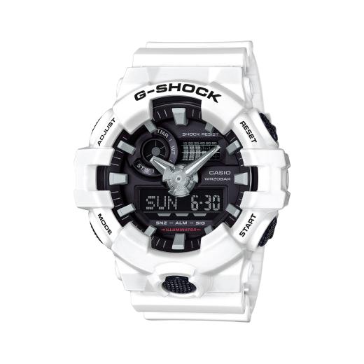 The ever popular GA700 comes in new colours. These models use original resin molding technology that makes it possible to form analog hands and multi-dimensional dial in a choice of two new colours: blue resin band with black face or white band with black face. These colours go well with trainers, parkas and other typical street fashion. GA700-7A.
